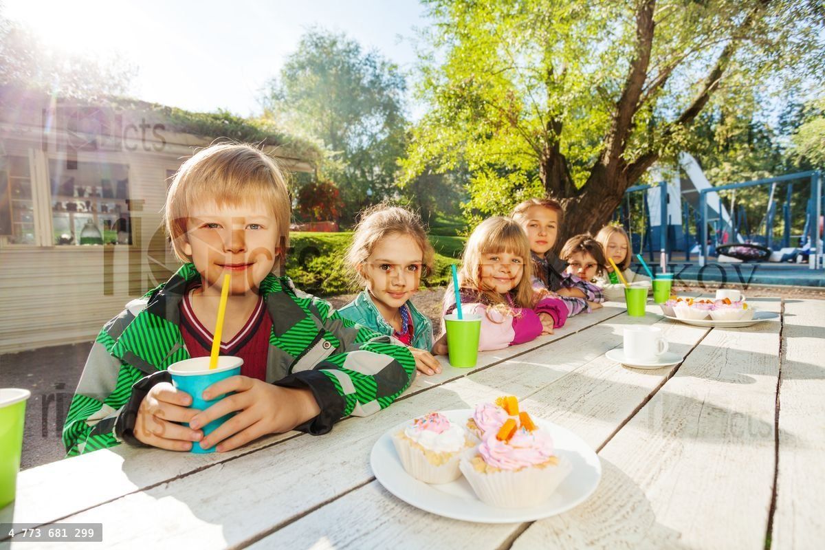 Row of children sitting together at wooden white table with colorful bright cups with straws and tasty cupcakes during sunny autumn day with trees on backgroundLoading purchase options...