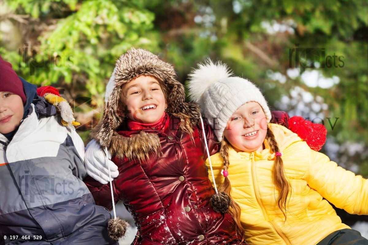 Happy smiling and hugging children in winter forest at the sunny dayLoading purchase options...
