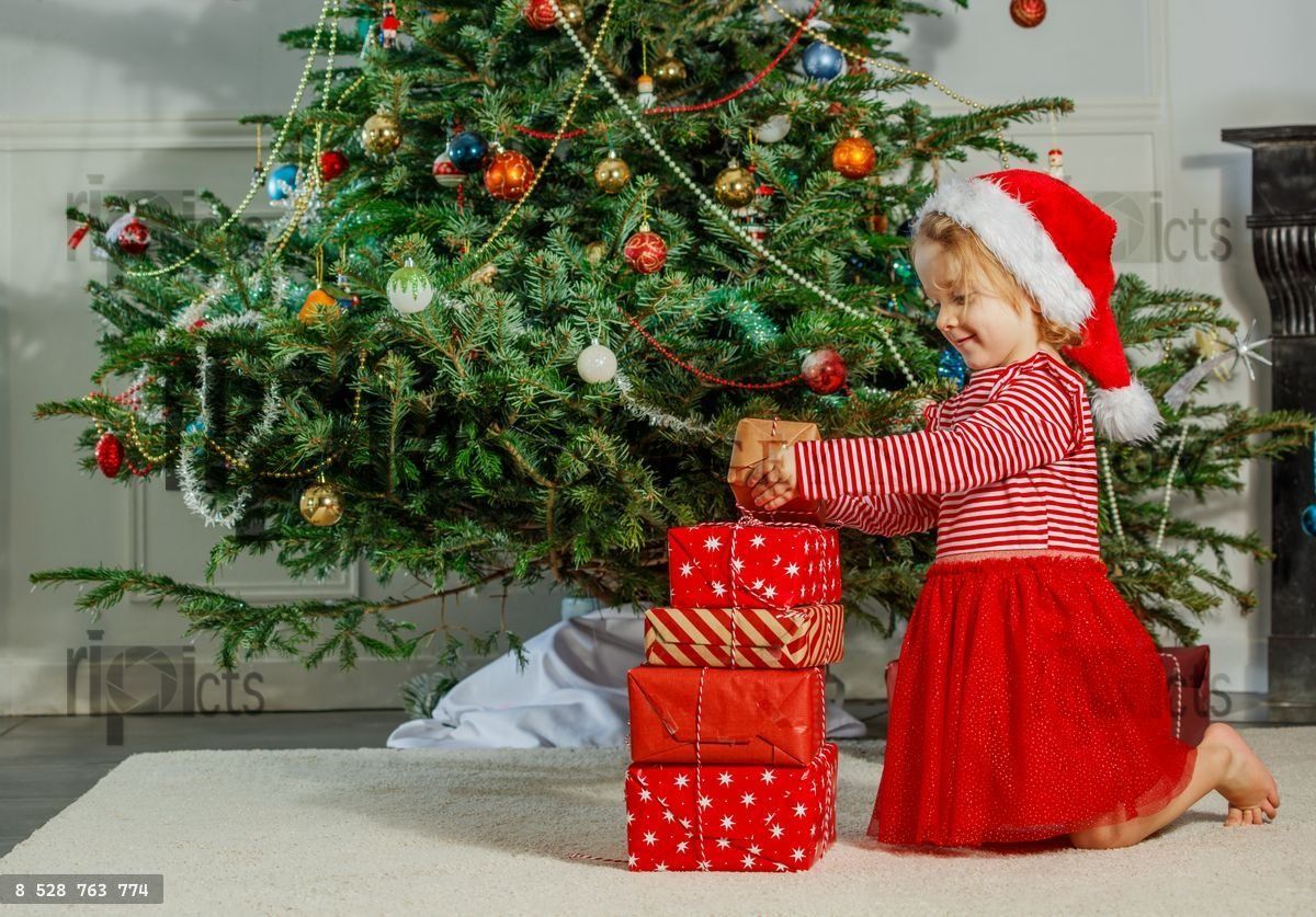 Delighted girl with a Santa hat presents wrapped Christmas boxes against the backdrop of a holiday treeLoading purchase options...