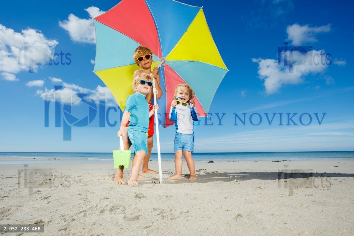 Group of three beautiful children, boys and a girl in sunglasses stand on the beach under parasol smiling over ocean on background low angle imageLoading purchase options...