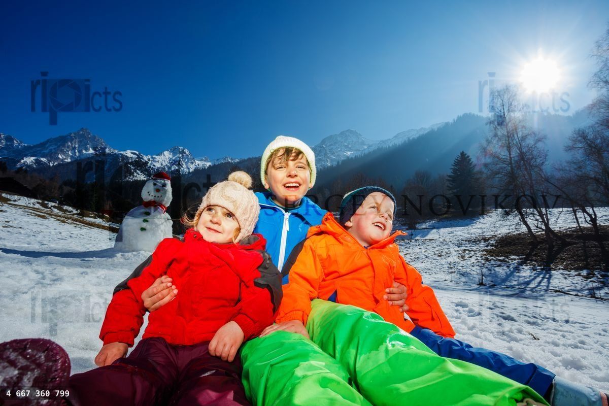 Close-up portrait of there happy kids siblings sit together near snowman over mountains background huggingLoading purchase options...