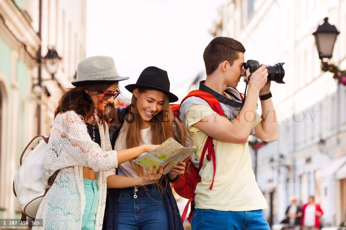Three friends together with city map and camera as tourists on the European street during summer day timeLoading purchase options...