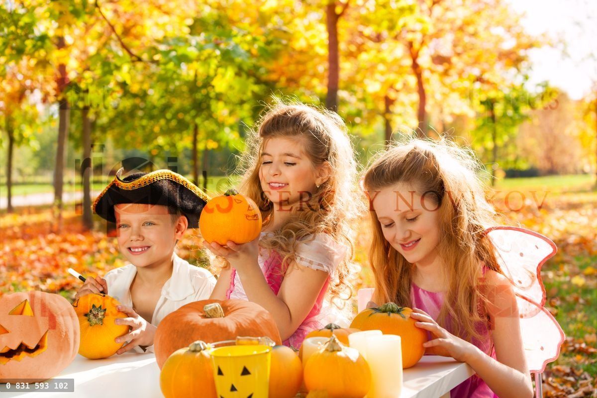 Three kids in costumes crafting Halloween pumpkins in the forest during sunny autumn dayLoading purchase options...