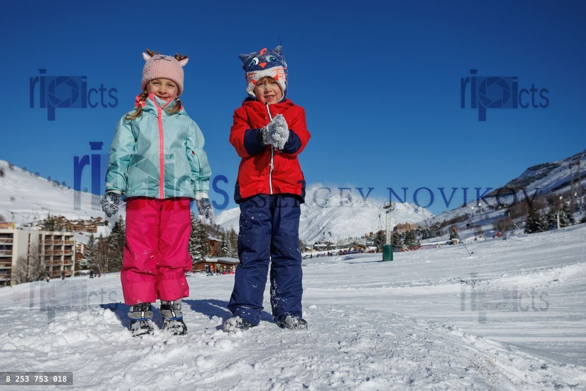 Two kids in colorful jackets display large clumps of fresh snow, standing aside on a groomed slope with village behindLoading purchase options...