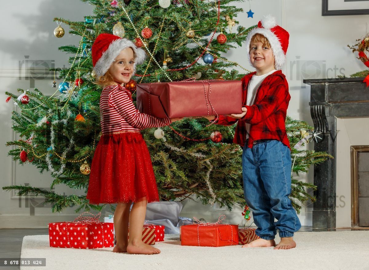 A little boy and girl in Santa hats pass a large wrapped present to each other, standing close to a Christmas tree decorated with ornaments.Loading purchase options...
