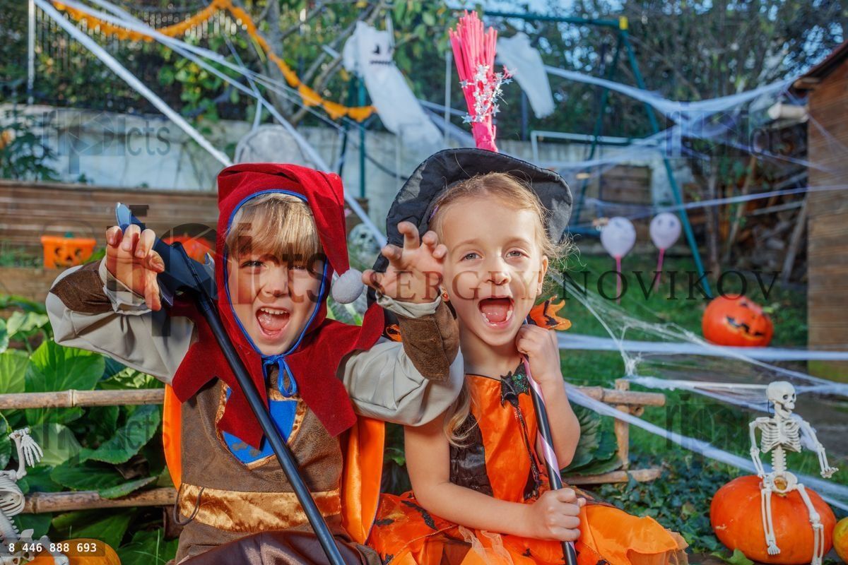 Two children, dressed as a witch and a jester, play scream, make scary faces in a backyard filled with Halloween ornamentsLoading purchase options...
