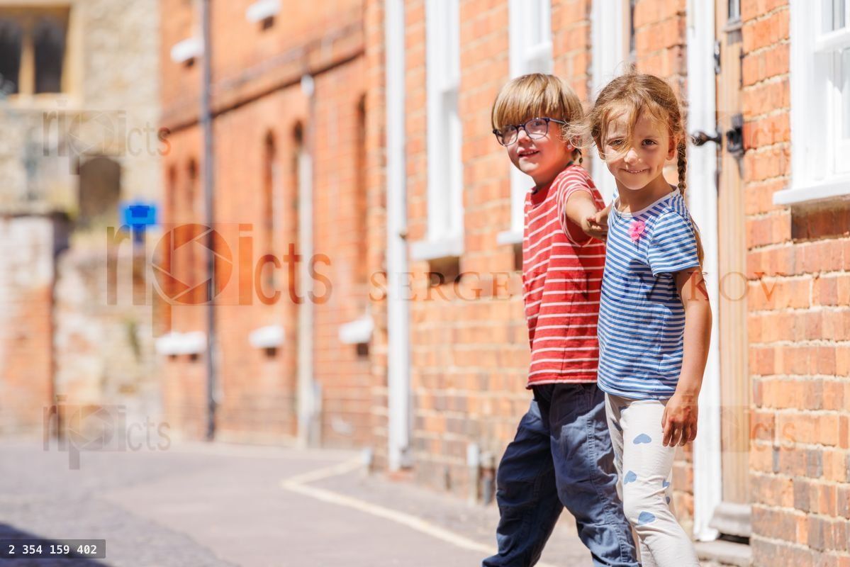 Two children, a boy and a girl, happily strolling down a sunny pathway hold hands flanked by red brick walls in countryside townLoading purchase options...