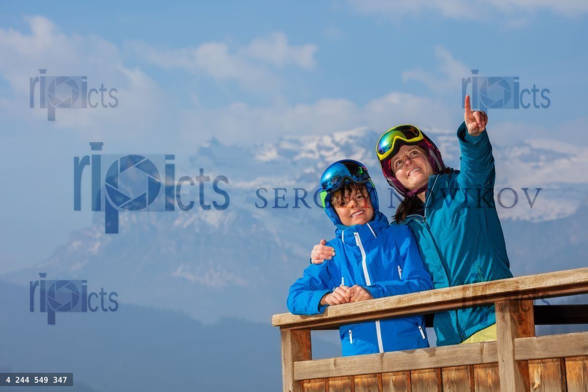 Smiling ski family on chalet balcony admiring Alps in helmet and mask overlooking mountains, talking sharing their slope experienceLoading purchase options...
