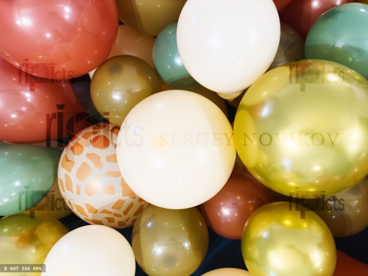 Wiele balonów w różnych kolorach, w tym bladożółty, jasnozielony, metaliczne złoto i ciemna czerwień, tworzących świąteczne tłoŁadowanie opcji zakupu...