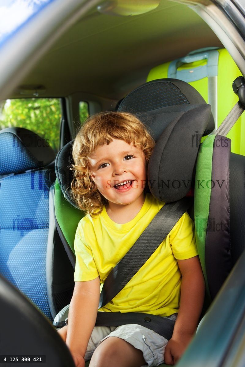 Menino sentado no assento infantil, feliz e rindo na parte de trás do carro